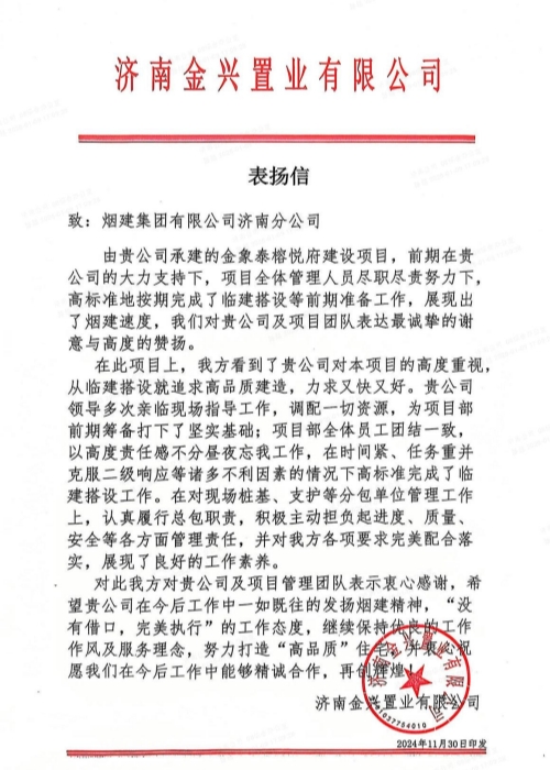 2024年11月30日,濟南公司收到濟南金興置業(yè)有限公司發(fā)來的表揚信。濟南公司承建的金象泰榕悅府項目,分公司領(lǐng)導(dǎo)多次親臨現(xiàn)場指導(dǎo)工作,調(diào)配一切資源,項目部全體員工團結(jié)一致,以高度責(zé)任感不分晝夜忘我工作。在對現(xiàn)場樁基、支護等分包單位管理工作上,認(rèn)真履行總包職責(zé),積極主動擔(dān)負(fù)起進度、質(zhì)量、安全等各方面管理責(zé)任,并對甲方各項要求完美配合落實,展現(xiàn)了良好的工作素養(yǎng)。